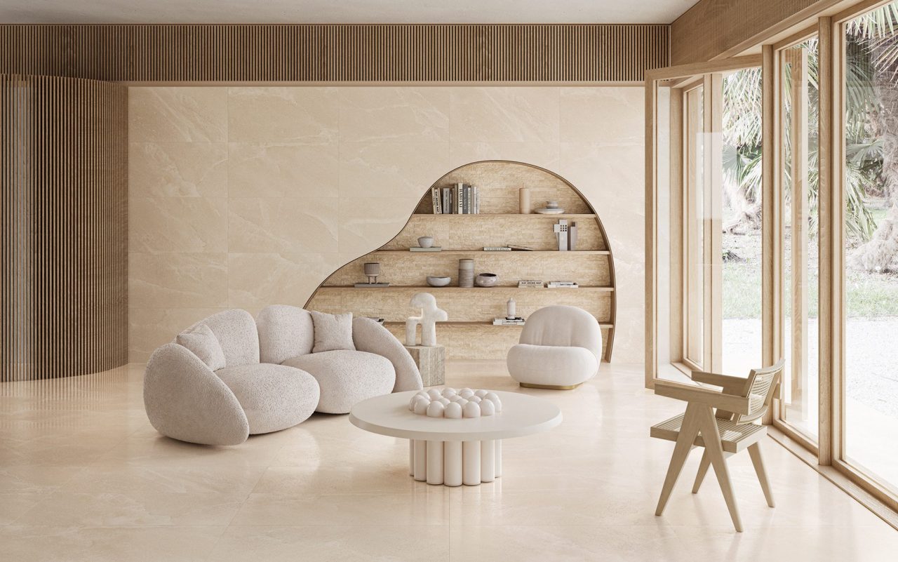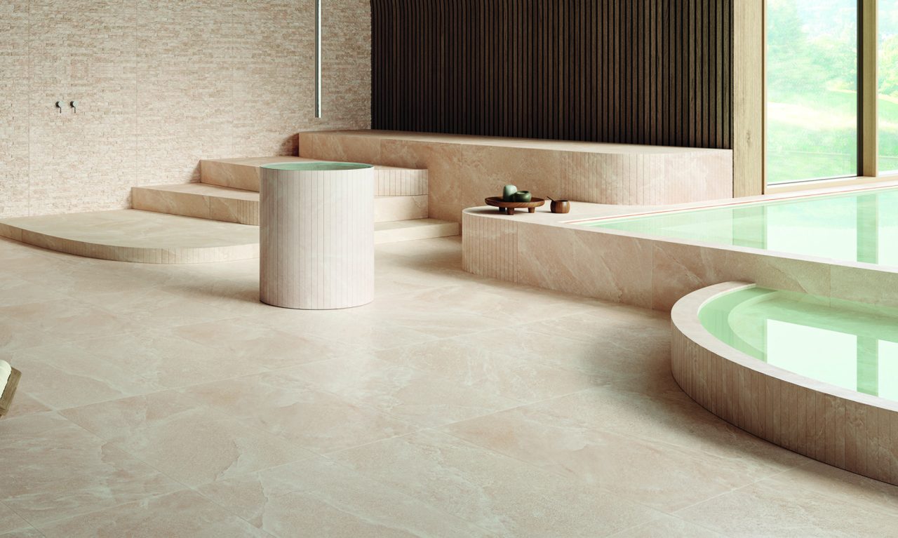 Salt Stone porcelain collection, interprets natural rock salt slabs with discretion, using a delicate refined colour range, ranging from neutral shades to hues such as pink and green. The result is a versatile product, which is suitable for a variety of lifestyles and environments.